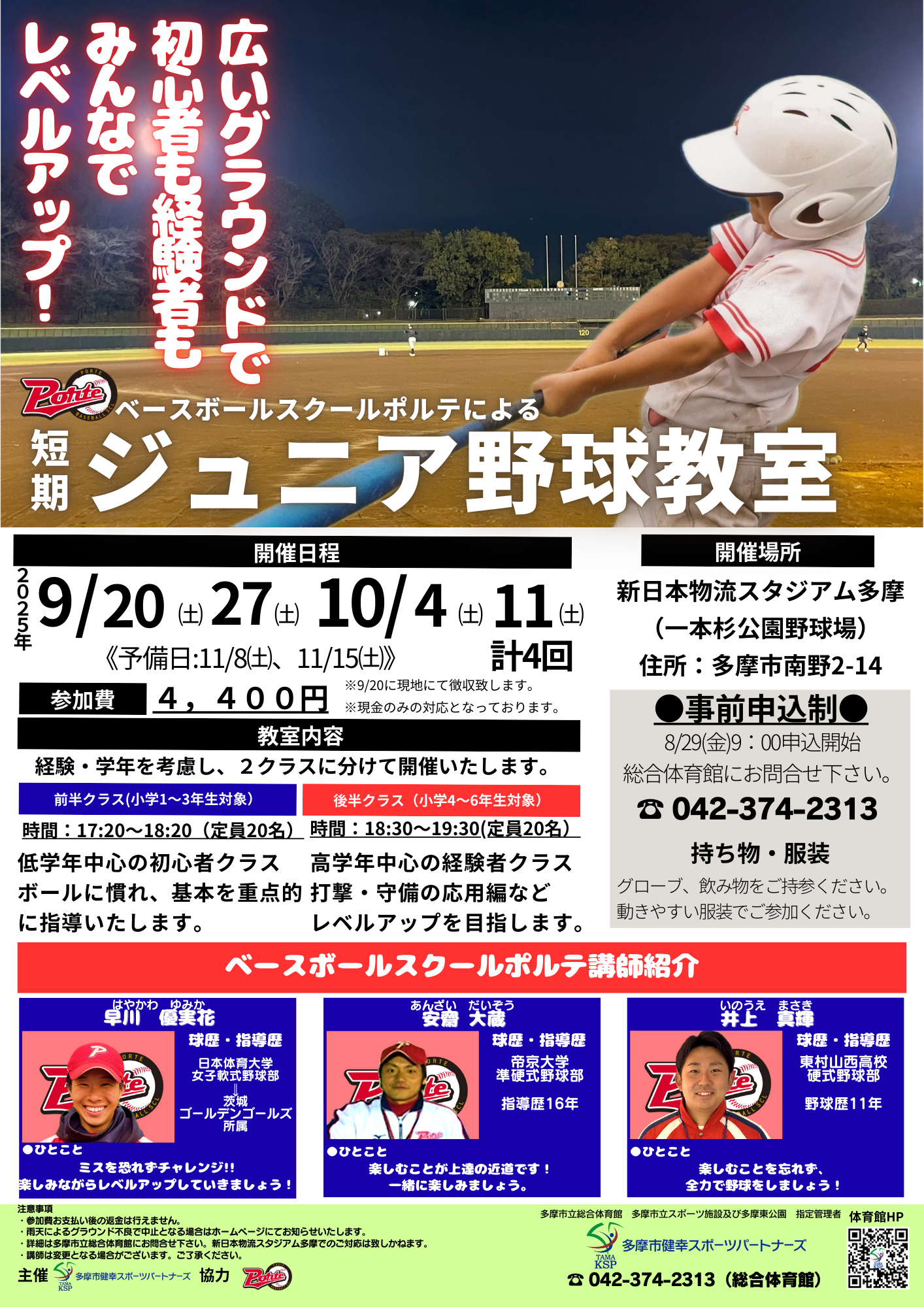 この度新日本物流スタジアム多摩(一本杉公園野球場)にて小学生対象のジュニア野球教室を開催する運びとなりました。