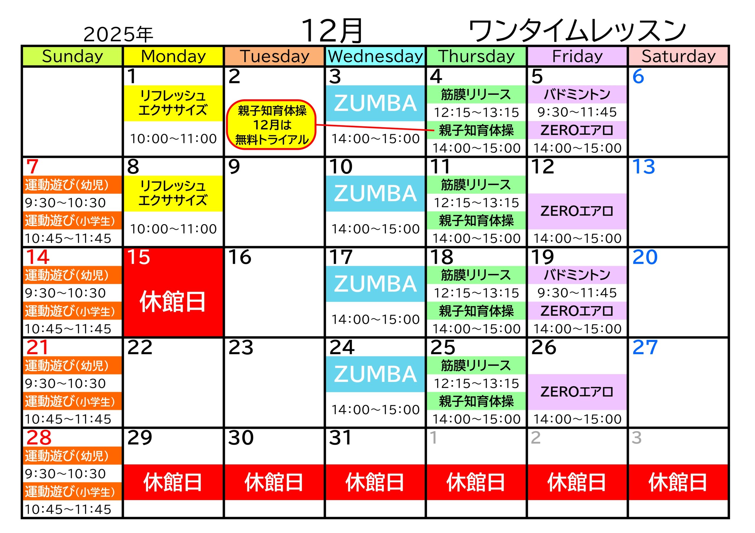 ☆最新☆ワンタイムレッスン12月カレンダー【体育館】